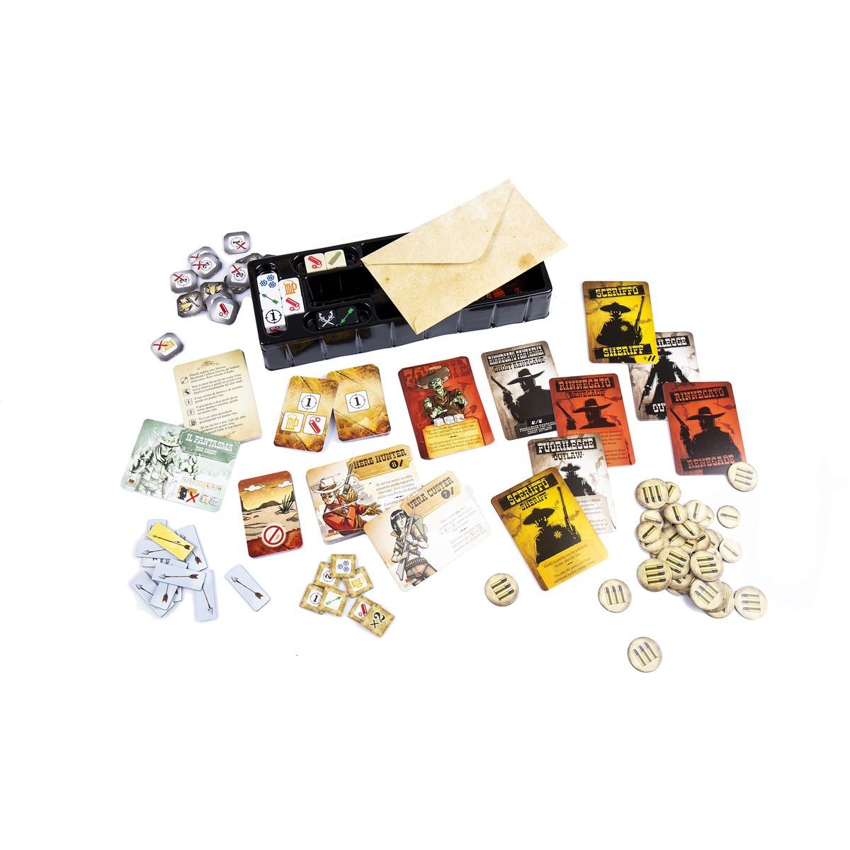 Obsah balení: 9 kostek, 36 karet postav, 18 karet rolí, karta ducha, malé karty, přehledové karty, žetony, pravidla