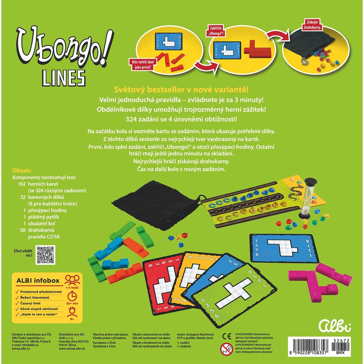 Ubongo Lines přináší napínavou a zábavnou logickou hru pro celou rodinu s 3D obdélníkovými dílky. Hráči sestavují tvary podle zadání a soutěží o drahokamy. Čtyři stupně obtížnosti umožňují přizpůsobení hry věku a zkušenostem hráčů, rozvíjí prostorovou představivost a strategické myšlení.