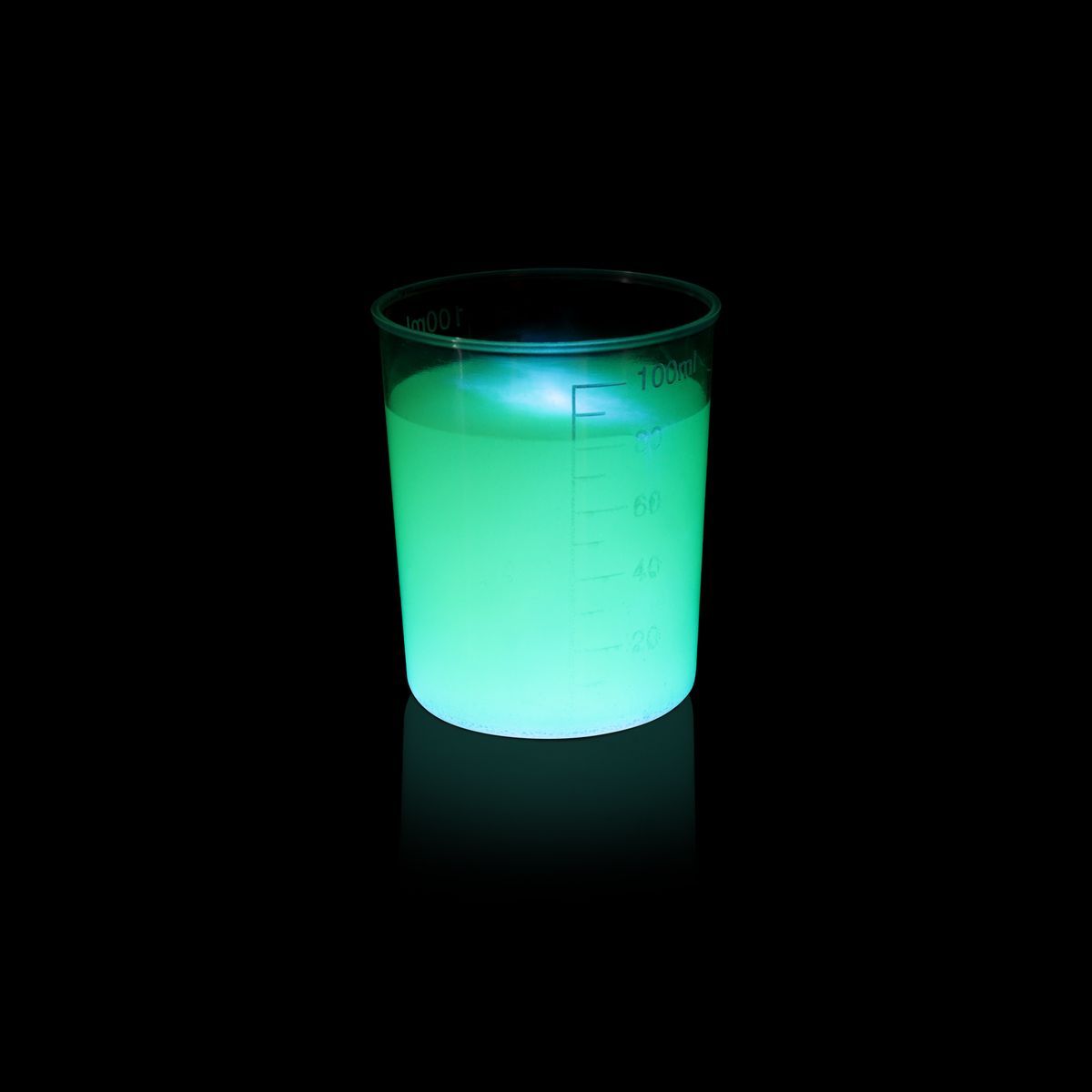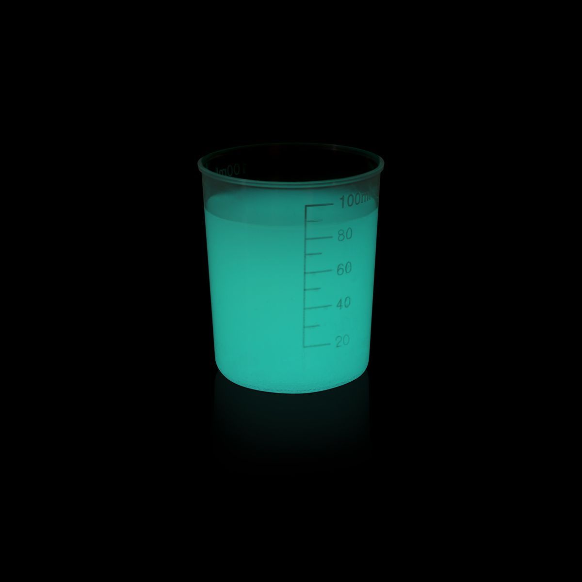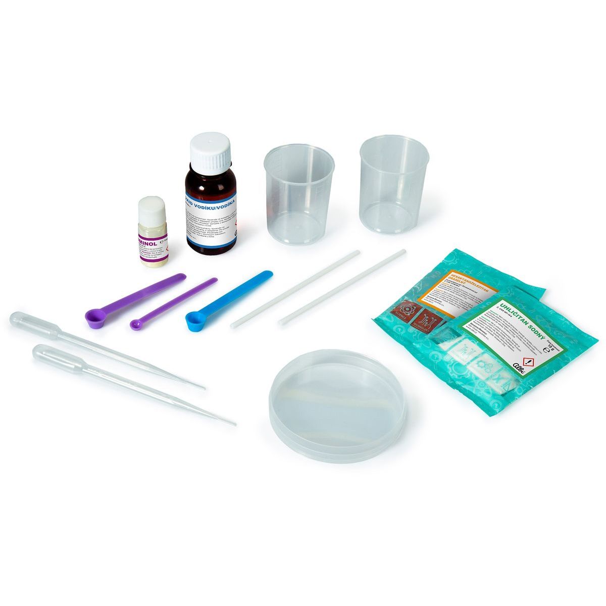 Obsah: lahvička Luminolu, sáček uhličitanu sodného, sáček hexakyanidoželezitanu draselného, sáček s lahvičkou peroxidu vodíku, 1 malá fialová lžička, 1 fialová a 1 modrá lžíce, 2 pipety, 2 míchací tyčinky, 2 odměrky, 1 petriho miska
