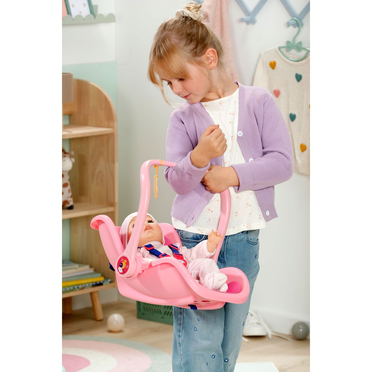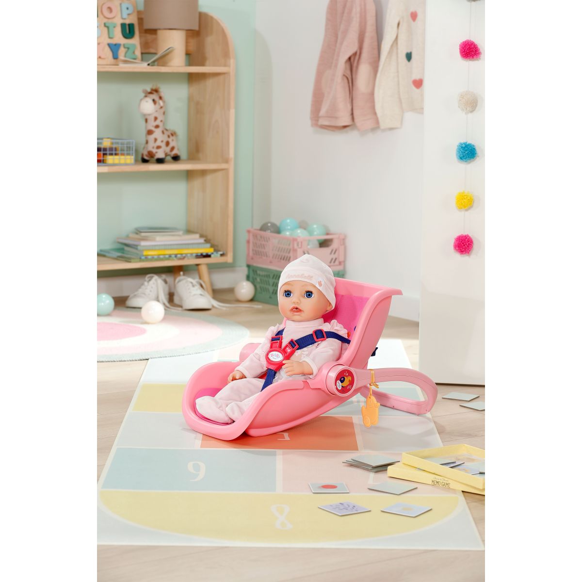 Díky madlu ji děti snadno nosí a bezpečnostní pás zajistí panence pohodlí a ochranu. Sedačka je lehká a vhodná pro panenky o velikosti 36 až 43 cm.