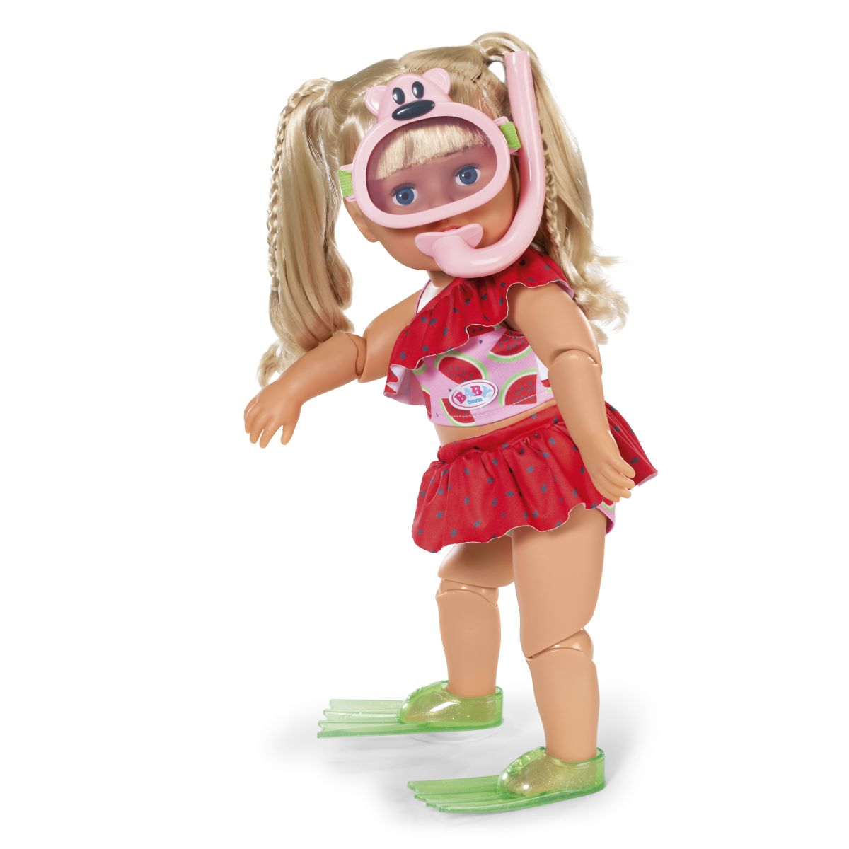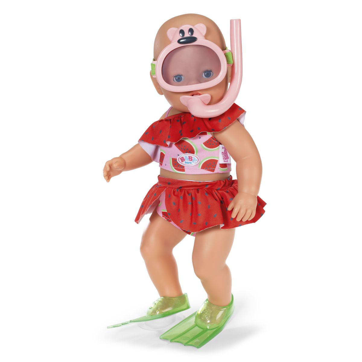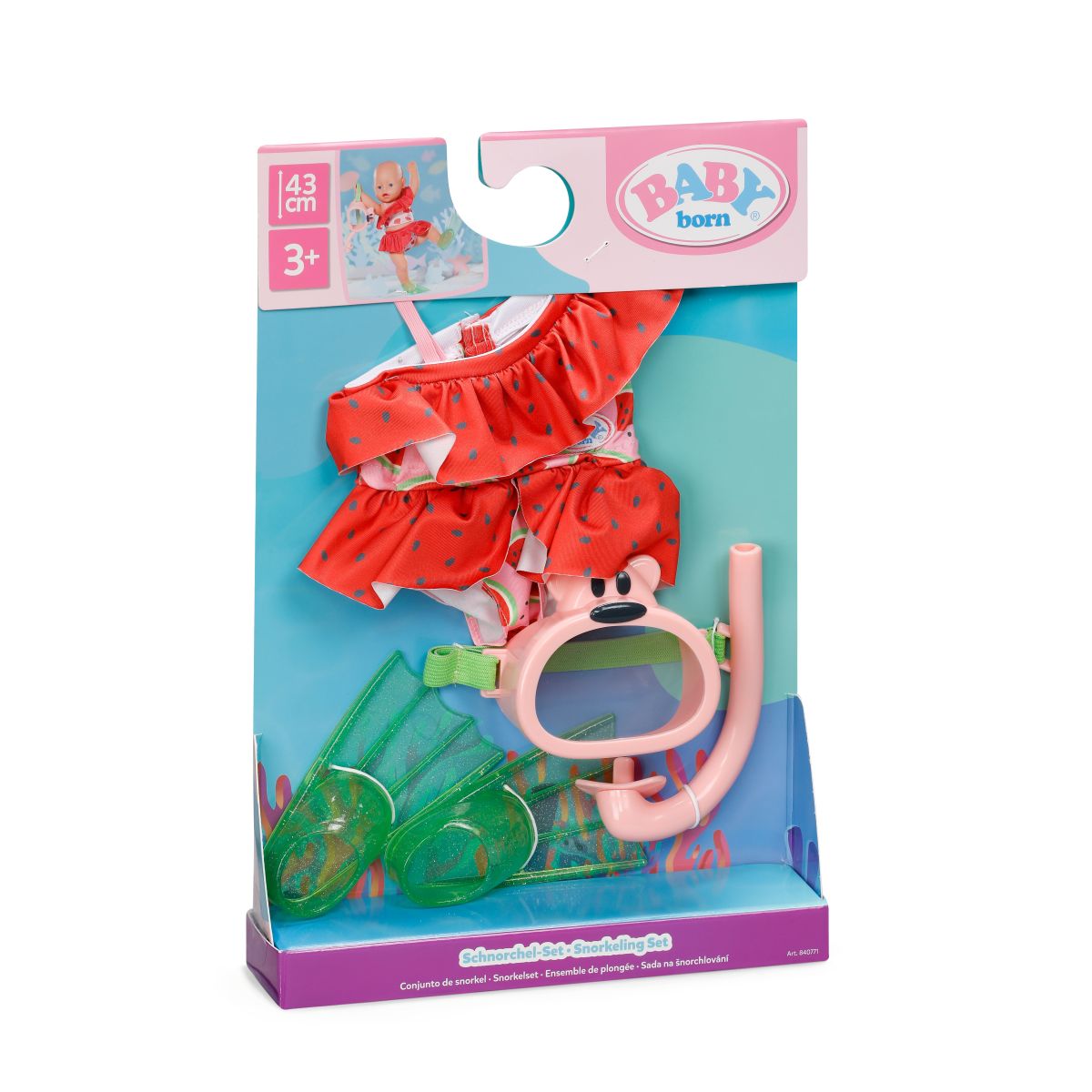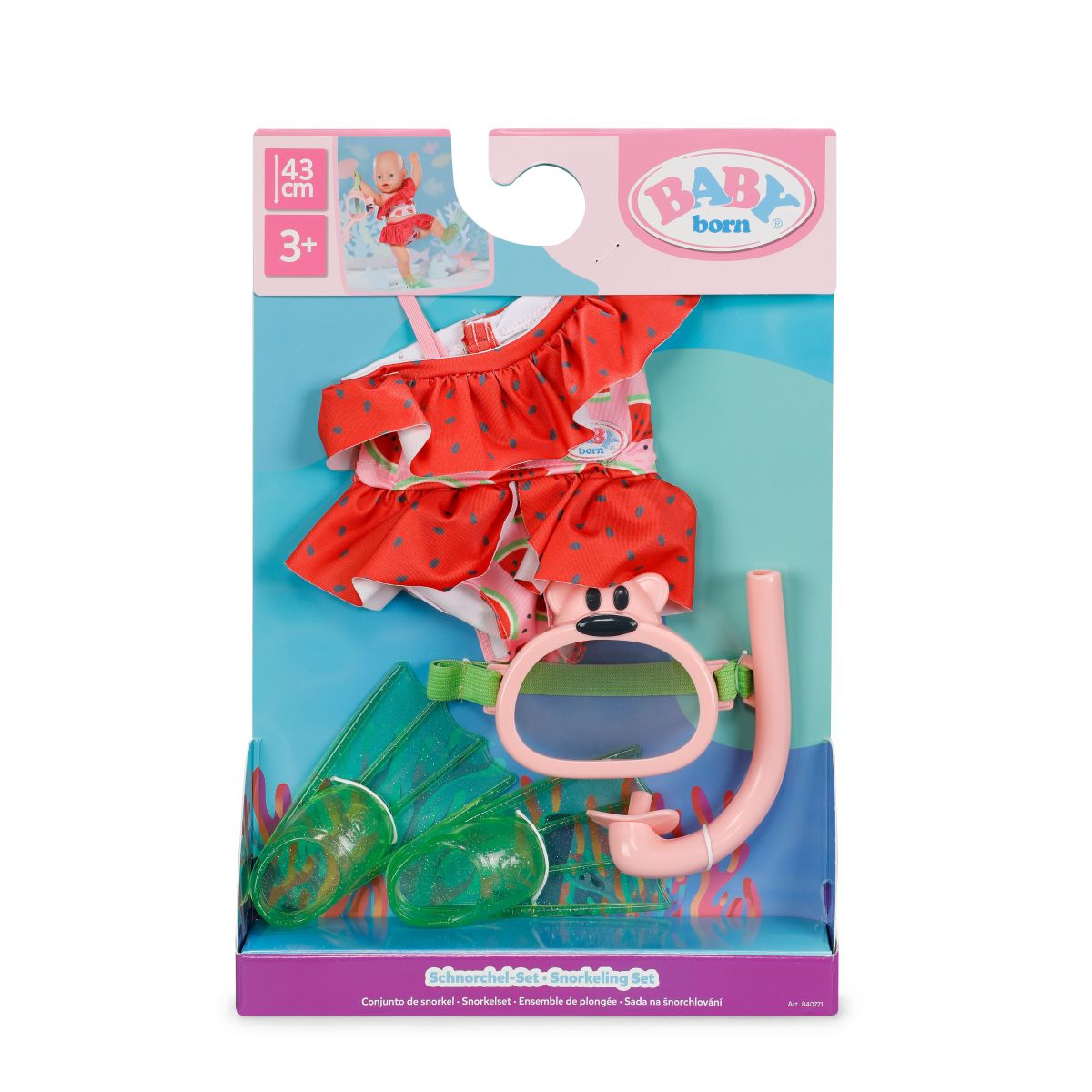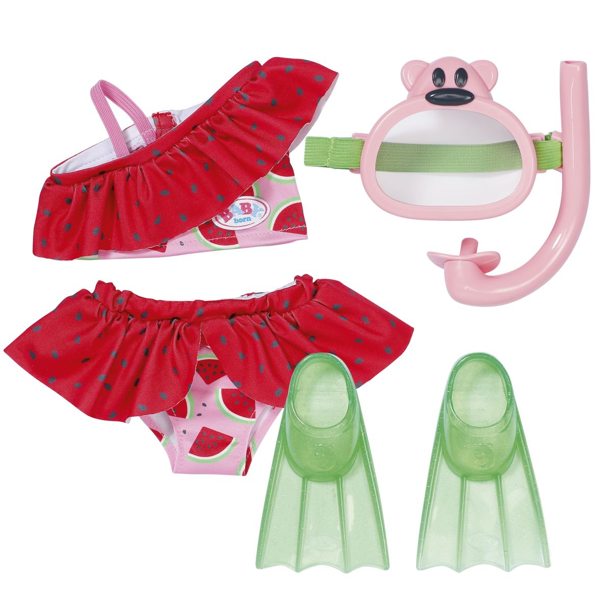 Obsahuje krásné dvoudílné plavky, potápěčské brýle, šnorchl a ploutve, díky kterým může vaše panenka objevovat svět pod vodou. Všechny doplňky jsou pečlivě vyrobené pro bezpečnou a hravou zábavu. Hodí se pro panenky o velikosti 43 cm a je vhodná pro děti od tří let.