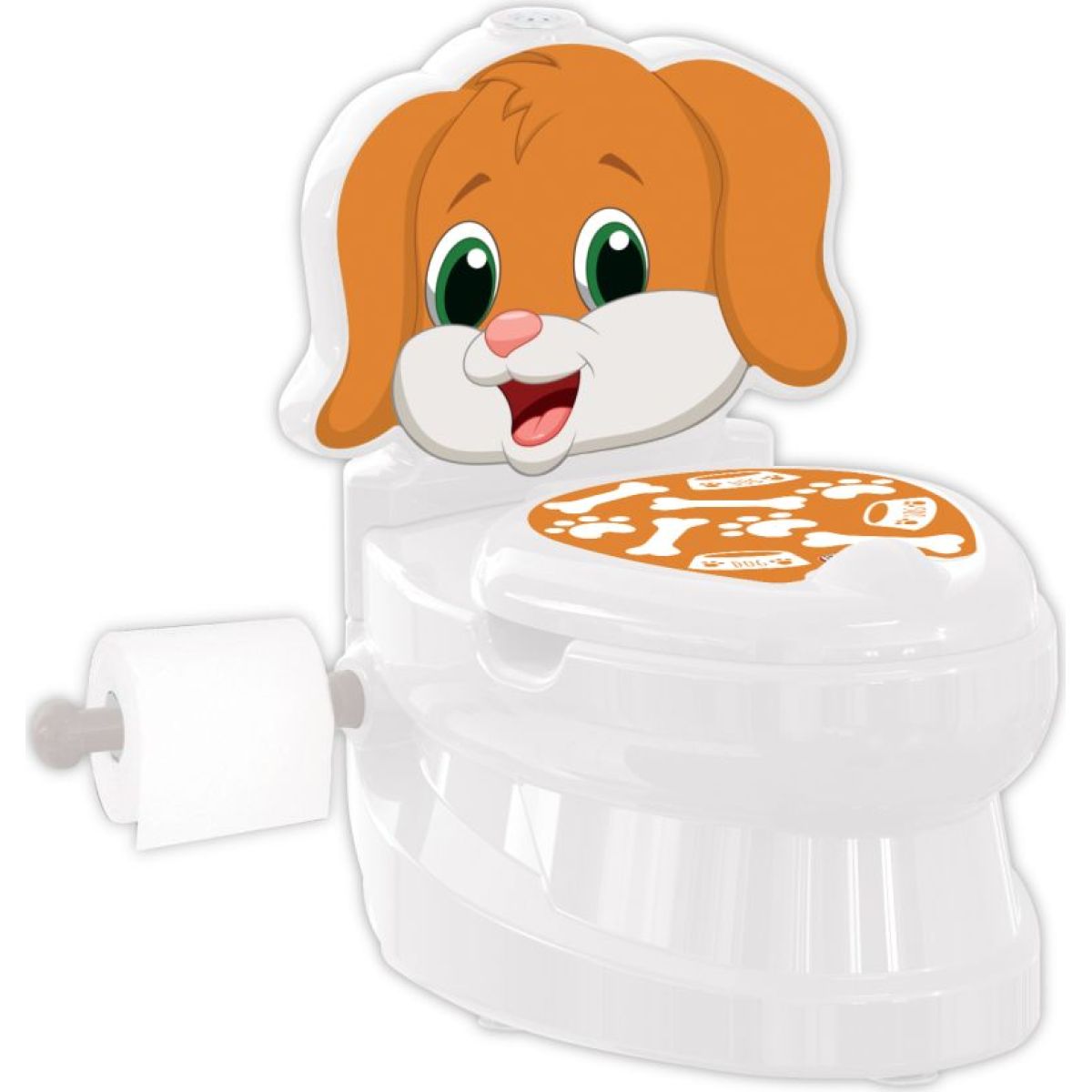 Bílý nočník s motivem pejska v podobě WC záchodové mísy. Je příhodným přechodem mezi nočníkem stojícím na zemi a používáním velké záchodové mísy v pozdějším věku.