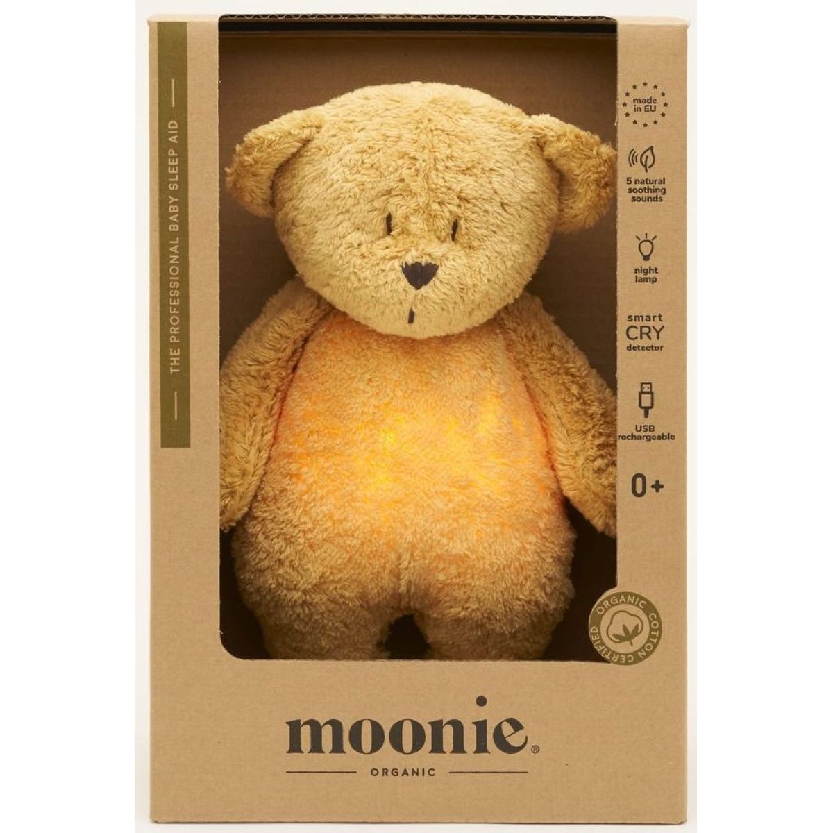 Zažijte klidné noci s Moonie Usínáčkem Medvědem 2.0 Organic Honey, který pomáhá miminku snadno usnout díky pěti přírodním zvukům a jemnému nočnímu světlu s výběrem sedmi barev. Hračka je vyrobena z organické bavlny a plněná recyklovaným materiálem, což je šetrné k přírodě. Nabíjí se pomocí USB kabelu a vydrží až 8 hodin provozu. Věk: Vhodné pro děti od 0 let Rozměry: 28 x 16 x 10,5 cm Baterie: vestavěná dobíjecí Zvuky: 5 přírodních, kalimba, 2 ukolébavky Barvy světla: 7 Časovač: 30, 60, 90 minut Senzor pláče: ano