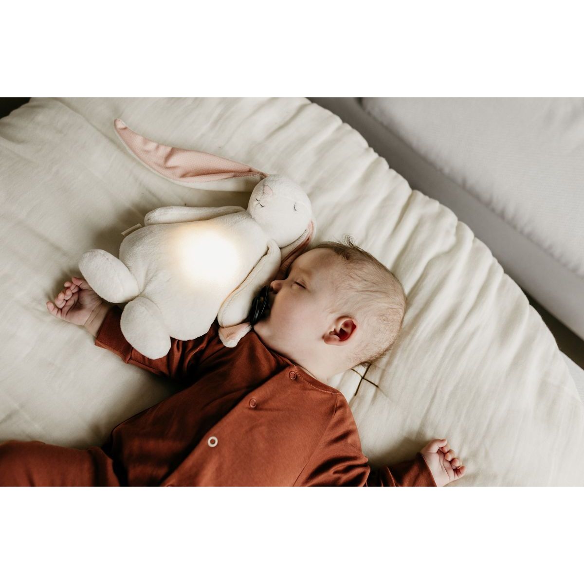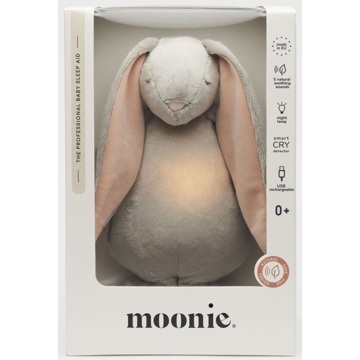 Zažijte klidné noci s Moonie Usínáčkem Zajíčkem 2.0 Cloud, který pomáhá miminkům usnout díky pěti přírodním zvukům a jemnému nočnímu světlu s výběrem sedmi barev. Hračka má také chytrý senzor, který zapne světlo a zvuky, když dítě začne plakat. Můžete si nastavit časovač na 30, 60 nebo 90 minut. Dobíjecí baterie vydrží až 8 hodin a USB kabel je součástí balení. Rozměry jsou 28 x 16 x 10,5 cm. Vhodné pro děti od narození. Klíčové parametry: - Vhodné pro děti od 0 let - Rozměry: 28 x 16 x 10,5 cm - Baterie: dobíjecí, součástí balení - Počet relaxačních zvuků: 5 - Počet barev nočního světla: 7 - Časovač: 30, 60, 90 minut - Inteligentní senzor pláče