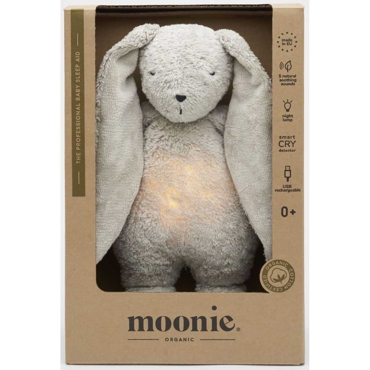 Zažijte klidné noci s Moonie Usínáčkem Zajíčkem 2.0 Organic Grey. Tento roztomilý zajíček pomáhá miminku usnout díky pěti přírodním zvukům, kalimbě a ukolébavkám. Svítící bříško nabízí sedm barev nočního světla, které dělá postýlku bezpečnou a útulnou. Funkce časovače a senzor pláče se postarají o pohodlí vašeho dítěte. Dobíjecí baterie vydrží až 8 hodin a USB kabel je součástí balení. Vhodné pro děti od narození. - Vhodné pro děti od 0 let - Rozměry: 28 x 16 x 10,5 cm - Dobíjecí baterie - Pět přírodních zvuků - Sedm barev nočního světla - Senzor pláče - Časovač na 30, 60 nebo 90 minut