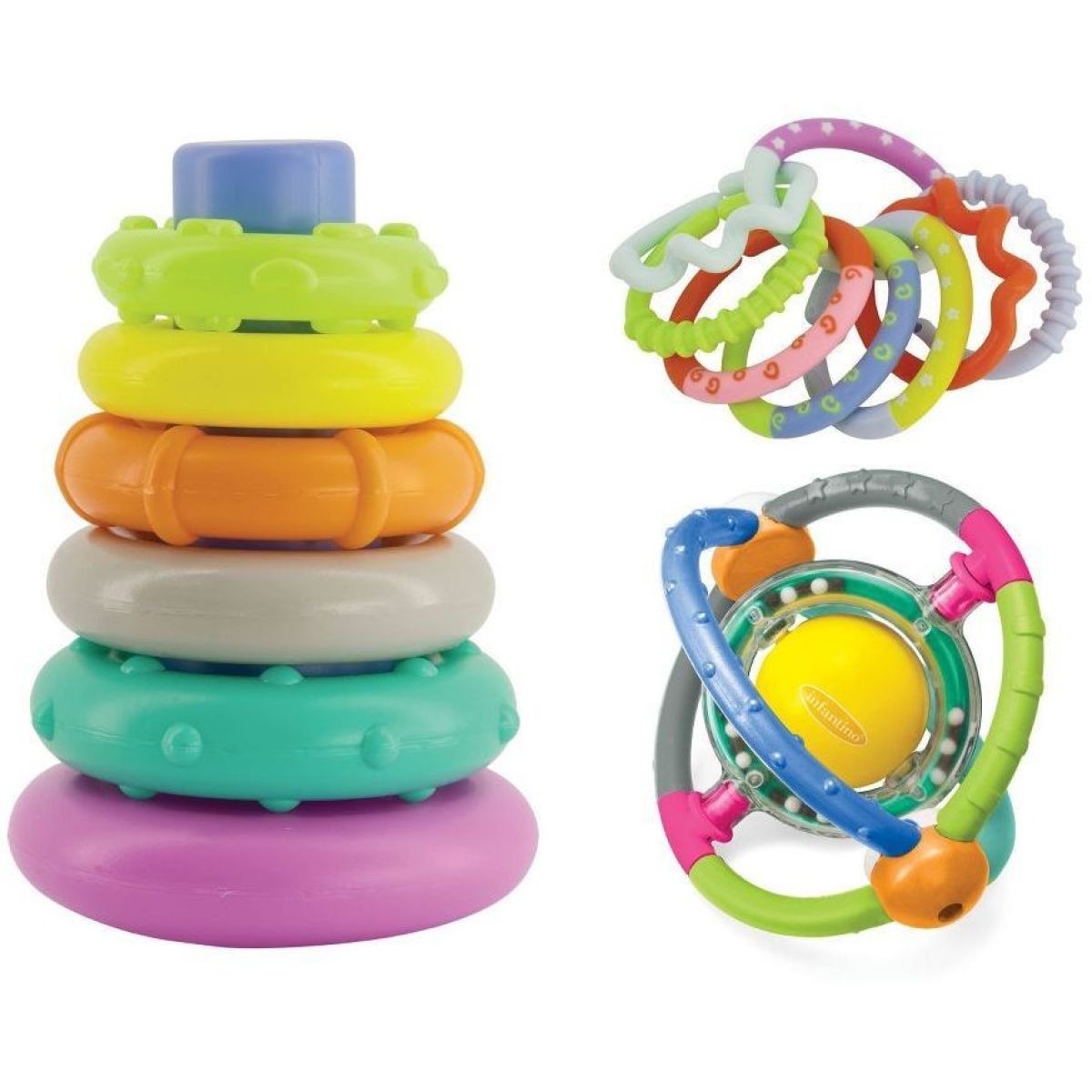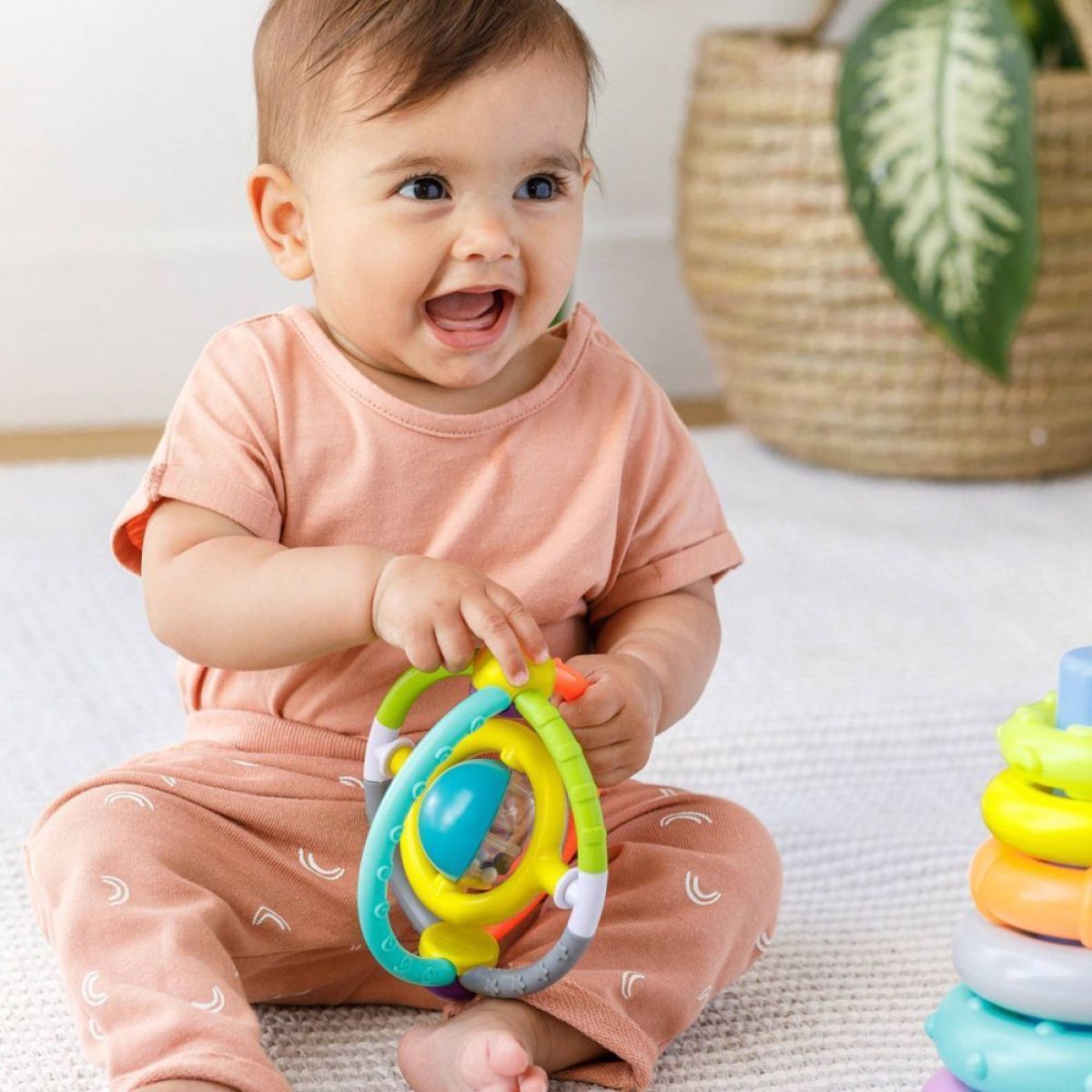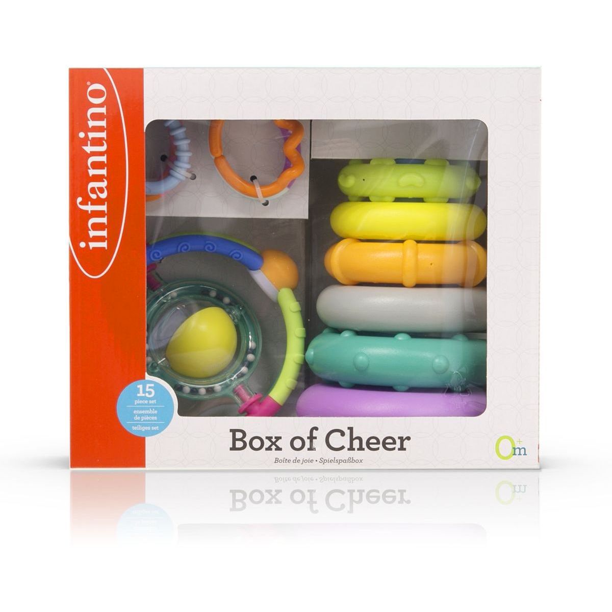 Zažijte nekonečná dobrodružství s touto sadou hraček Box of Cheer, která je perfektní pro nejmenší děti od narození. Sada obsahuje lehké chrastítko s různými texturami a osm propojitelných kroužků, které děti mohou spojovat nebo používat samostatně. Pyramida s barevnými kroužky pomáhá rozvíjet jemnou motoriku a koordinaci. Hračky jsou bezpečné a zábavné pro vaše miminko. Vhodné pro děti od narození. Věk: Miminko (0-12 měsíců).