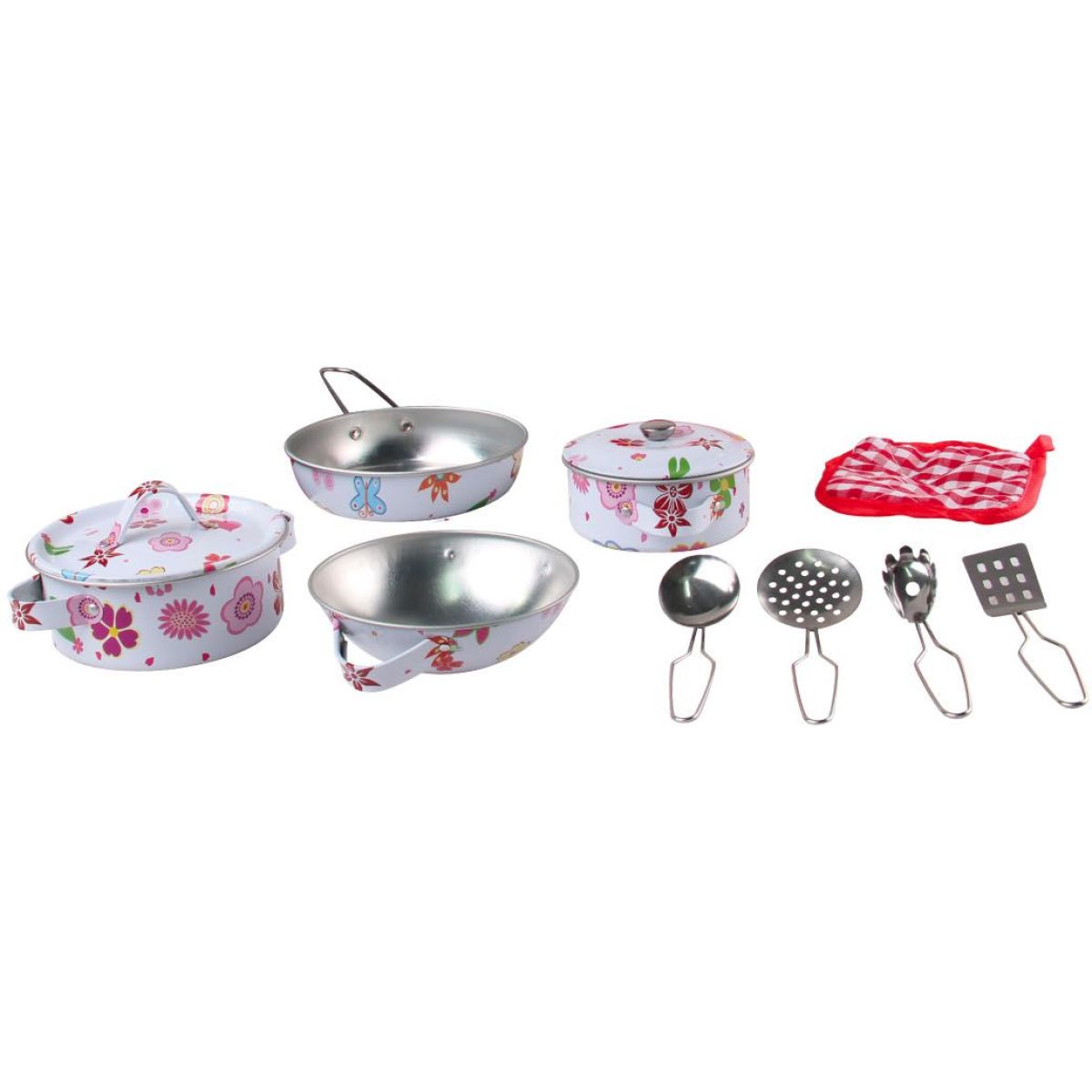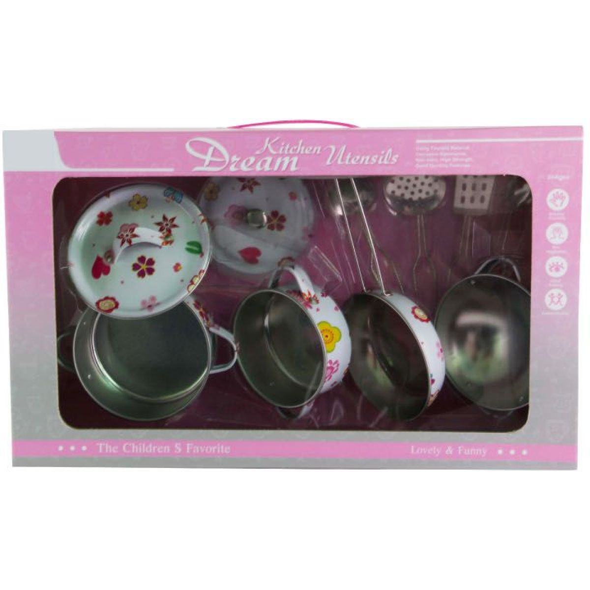 Tato 11 dílná sada plechového nádobí Sparkys s krásným potiskem je ideální pro malé děti od tří let, které rády napodobují vaření jako dospěláci. Kovový materiál zaručuje pevnost a dlouhou životnost celé sady, takže si vaše ratolesti mohou hrát bez obav o poškození nádobí. Všechny části jsou přizpůsobeny dětským rukám pro snadné uchopení a bezpečné používání při hrách v kuchyňce.