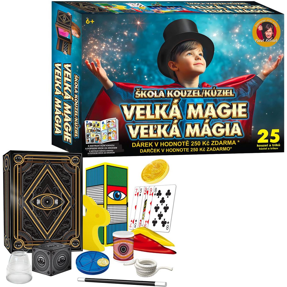 Chcete zažít opravdové kouzelnické dobrodružství? Sadu Sparkys Škola kouzel - Velká magie tvoří 25 jedinečných triků, které nadchnou malé i větší kouzelníky! V sadě najdete obří hrací karty, barevné šátky i tajemné rekvizity pro efektní vystoupení s kachnou nebo králíkem. Naučíte se vše snadno díky knížce i videu krok za krokem. Kouzla jsou bezpečná pro děti od 8 let při dozoru dospělých a skvěle zabaví celou rodinu. Tato sada je ideálním dárkem na narozeniny nebo Vánoce, který přinese hodiny zábavy a úžasných momentů!