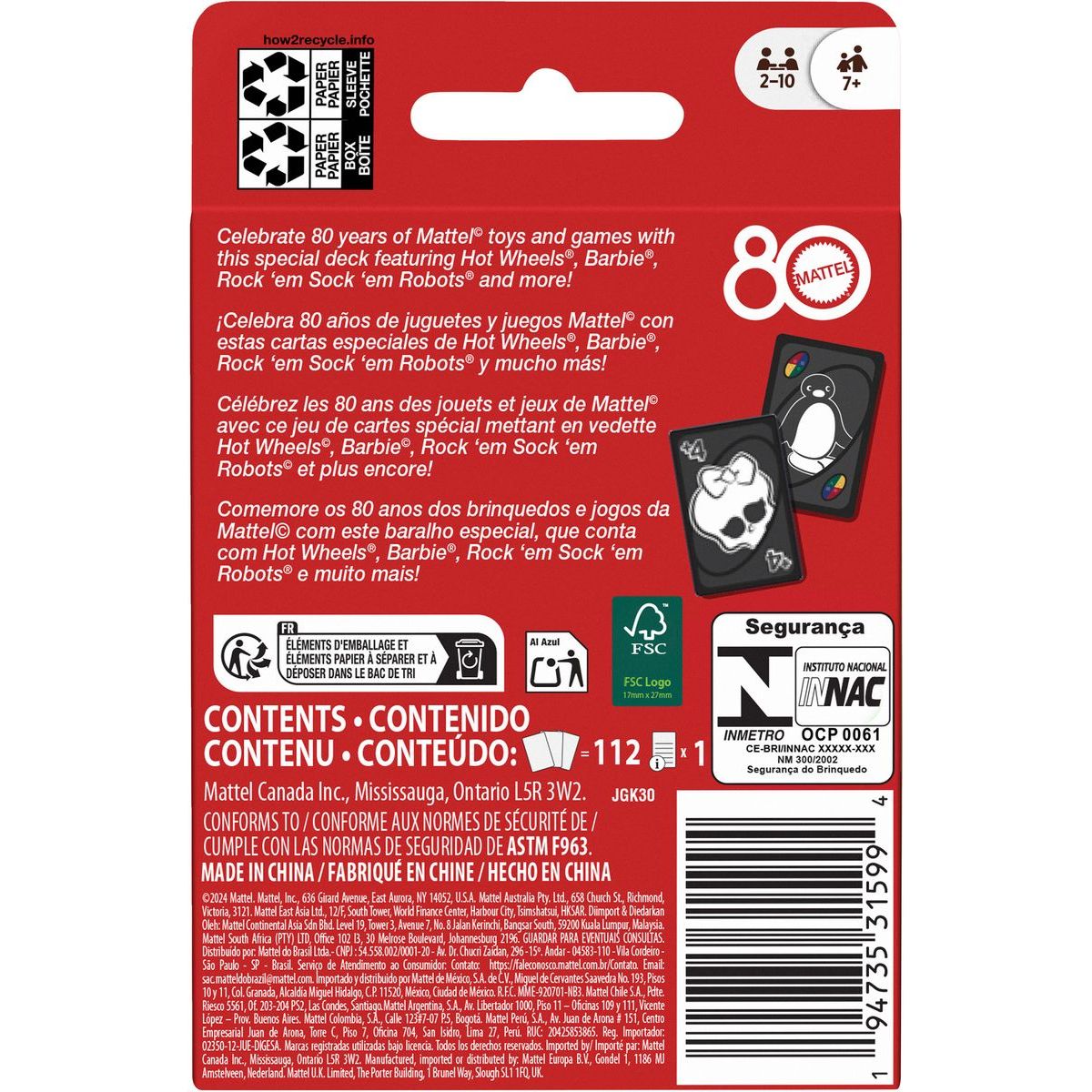 UNO k 80. výročí Mattel přináší zábavu pro malé i velké hráče od 7 let. Hra je plná barevných karet s čísly, na kterých najdete grafiku inspirovanou slavnými hračkami Mattel. Spojujte barvy a čísla a snažte se zbavit všech svých karet jako první! A když máte poslední kartu, nezapomeňte zakřičet "UNO!" – to je ten pravý moment napětí a radosti při hraní.