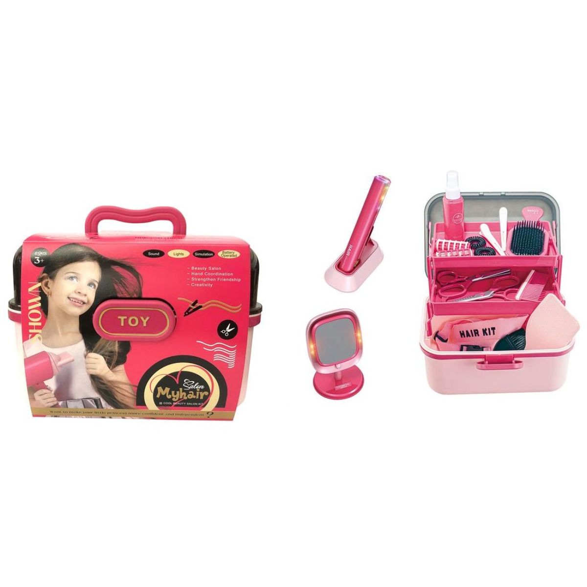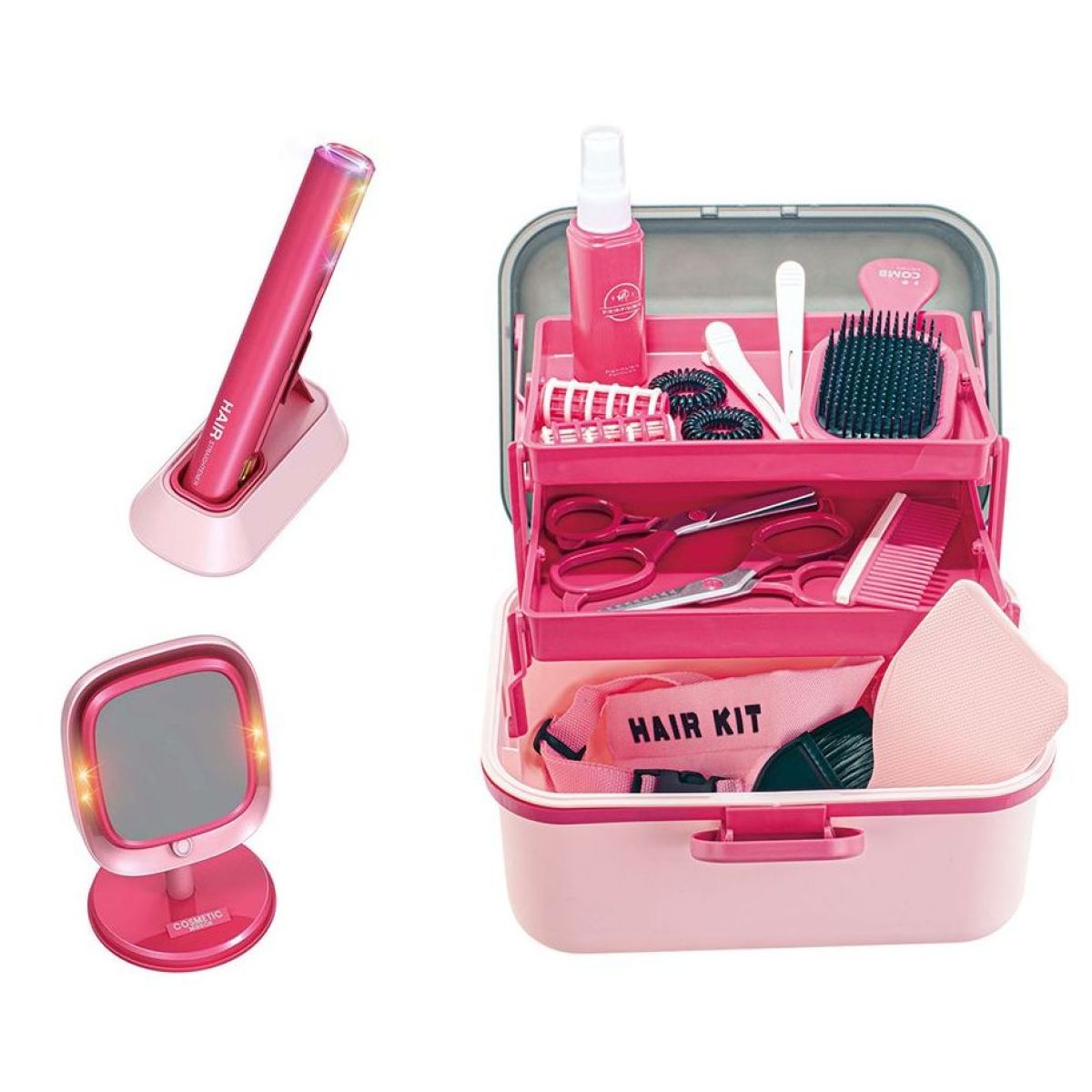 Růžová vlasová žehlička stojí v nabíjecím stojánku a doplňuje ji stolní zrcadlo s osvětlením po stranách, které dodává hře realistickou atmosféru. Praktický kufřík s držadlem ukrývá veškeré kadeřnické náčiní a díky rozkládacím přihrádkám zůstává vše přehledně uspořádané.