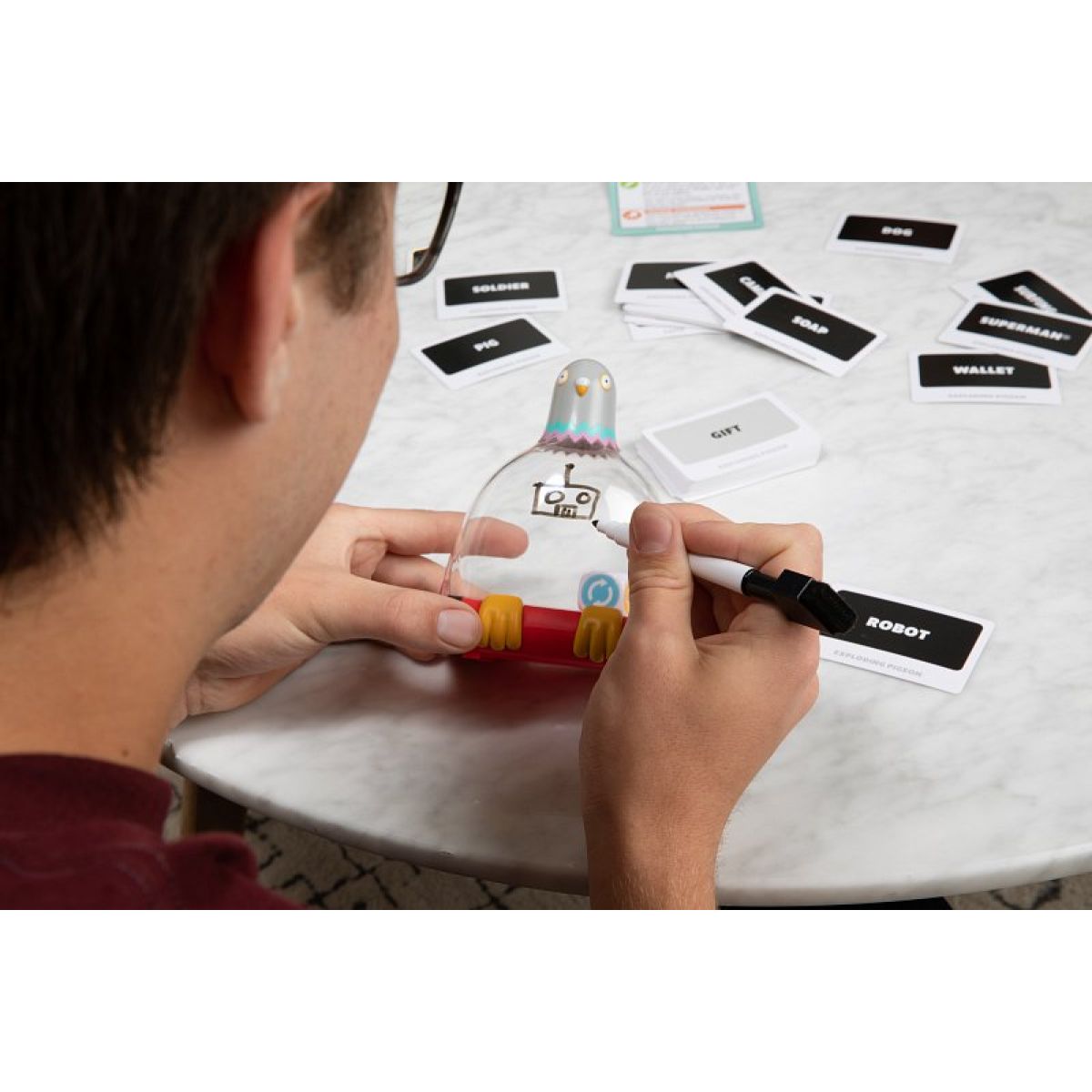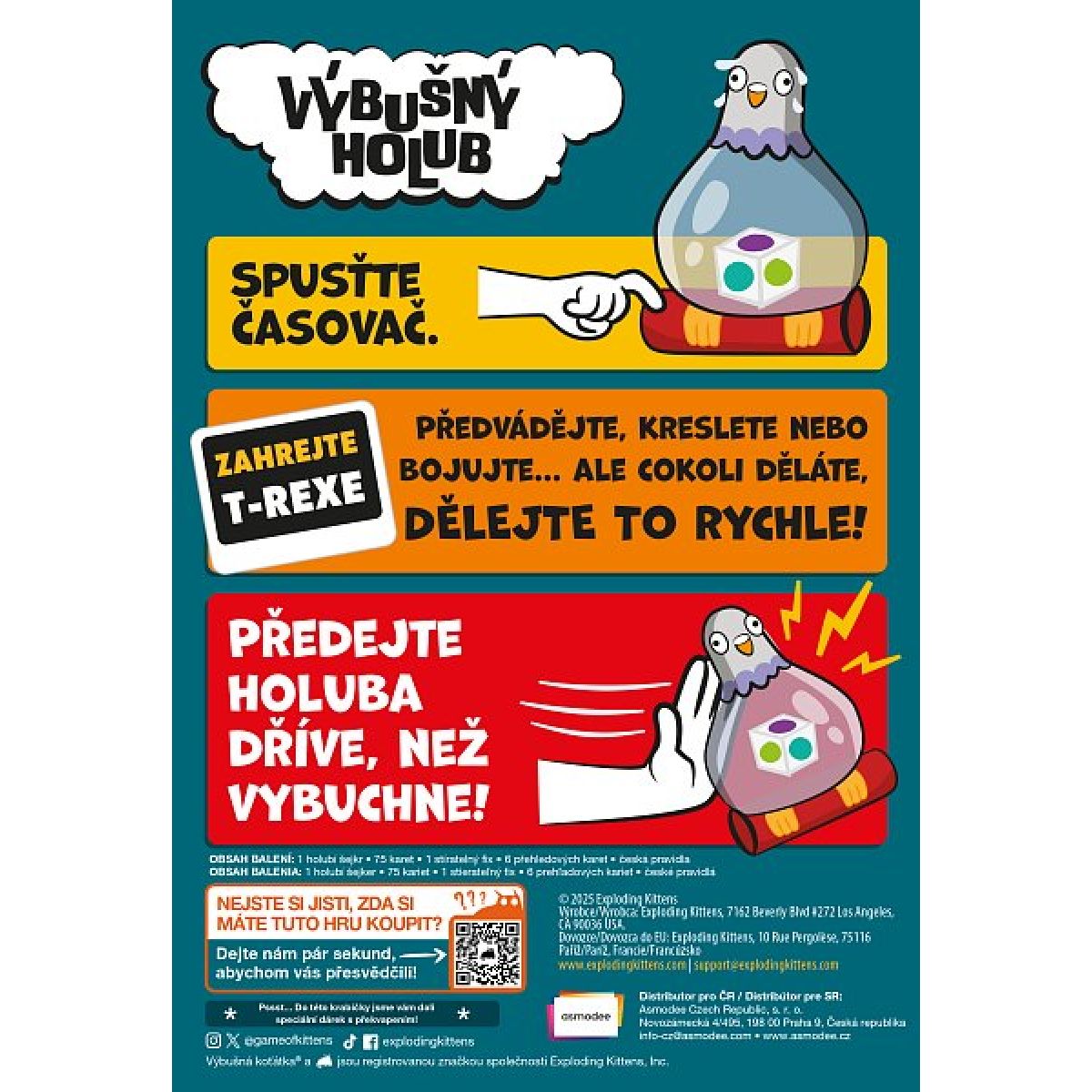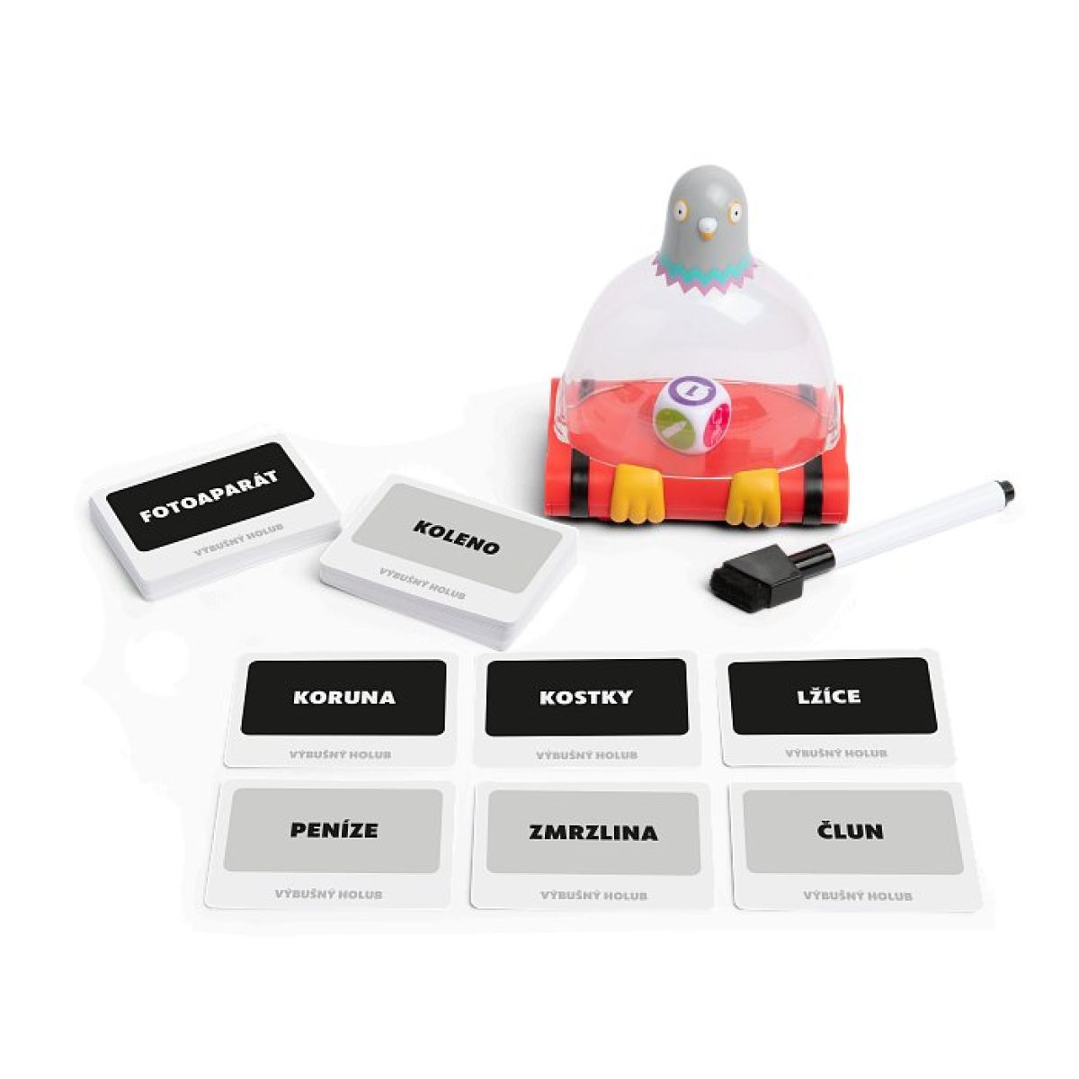 S Výbušným holubem se připravte na frenetickou jízdu, ve které rozhoduje každá vteřina. Kreslete, předvádějte i napovídejte – a hlavně předávejte holubí šejkr dál, než začne vibrovat a symbolicky „vybuchne“. Každá výzva je jiná, každý okamžik nepředvídatelný a každý úspěch závisí na souhře vašeho týmu. Čeká vás zábava plná smíchu, rychlých reakcí a nečekaných momentů, které rozproudí jakoukoliv párty.